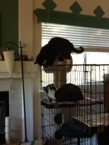 The first time we allowed them in the same room together they fought fiercely. During the scuffle Bebe knocked Max off a kitchen ledge and he dislocated a toe. He had to wear a boot and spend time confined to a kennel while healing.